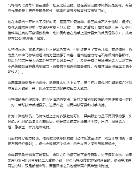 马特塔作为一个战术型的中锋,在切尔西的比赛中展现出他的战术意识和空间制造力。他擅长顶在禁区内,为队友创造射门机会,配合能力优秀,但争高球能力稍欠火候。他或许不是最出色的射手,但却是一名能够胜任多个位置的球员。